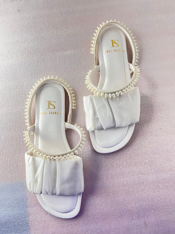 These stunning slip-ons feature intricate handwork with stones, cutdana, beads, threads, and sequins, brought to life in a delicate 3D floral design. A soft cushioned sole and slight heel add comfort, while tissue flowers at the center enhance the luxe appeal. Perfectly blending tradition with trend, these sliders are designed to elevate every festive or wedding look with effortless style.